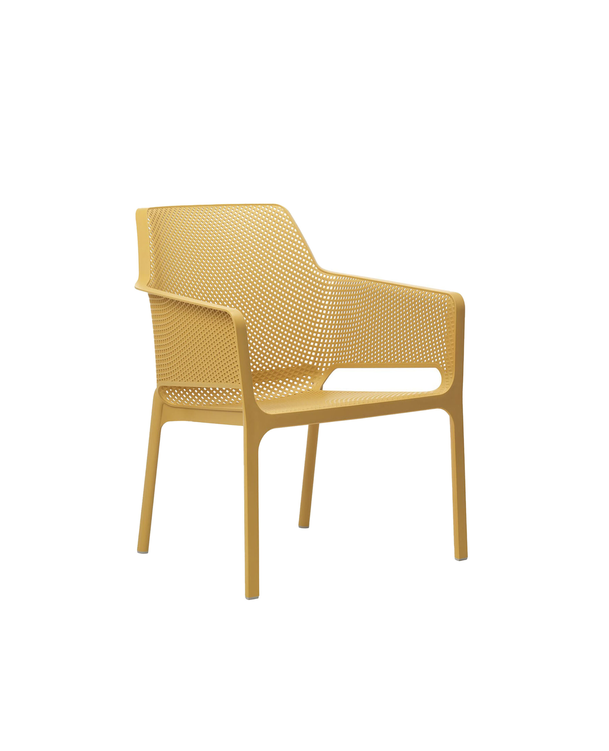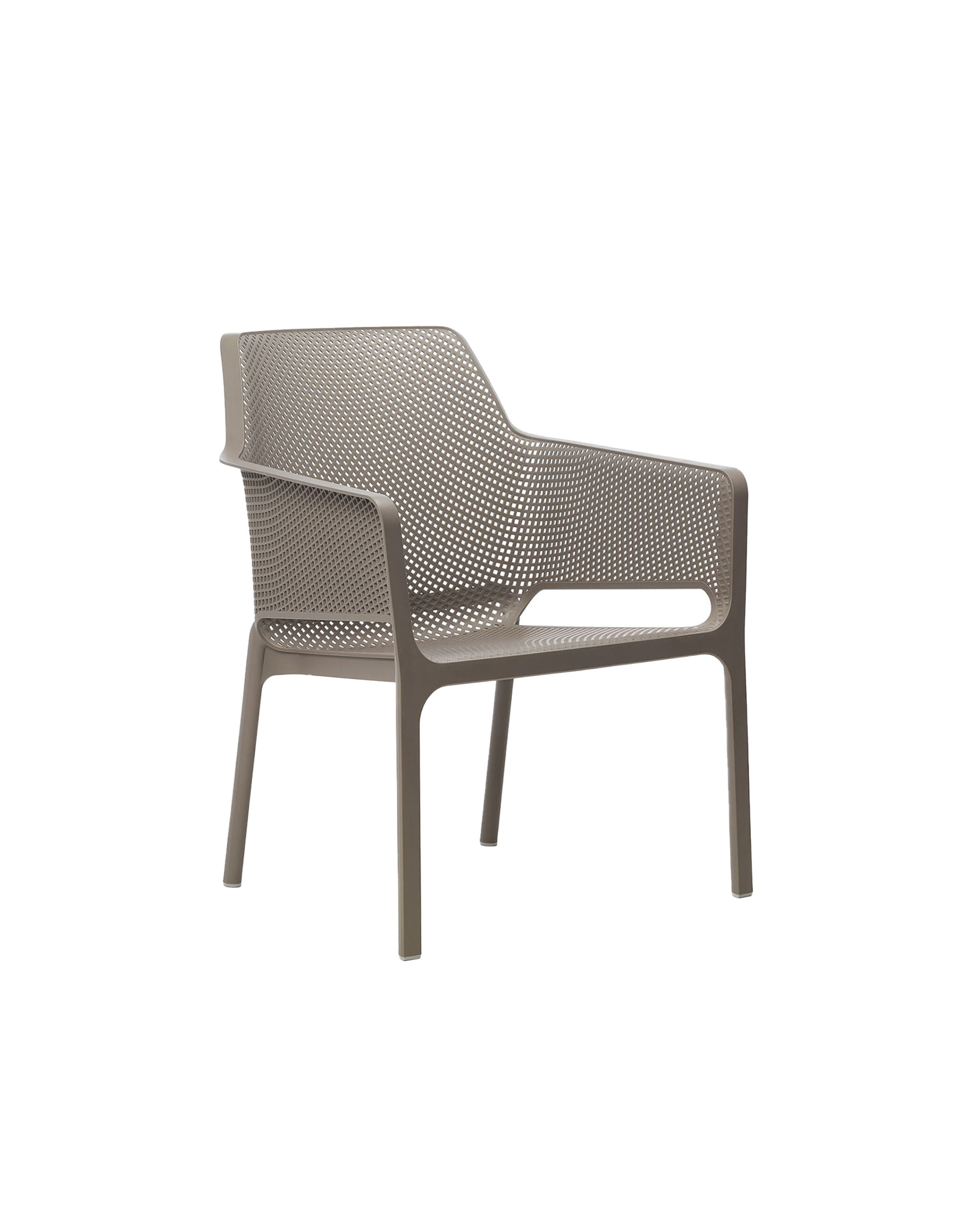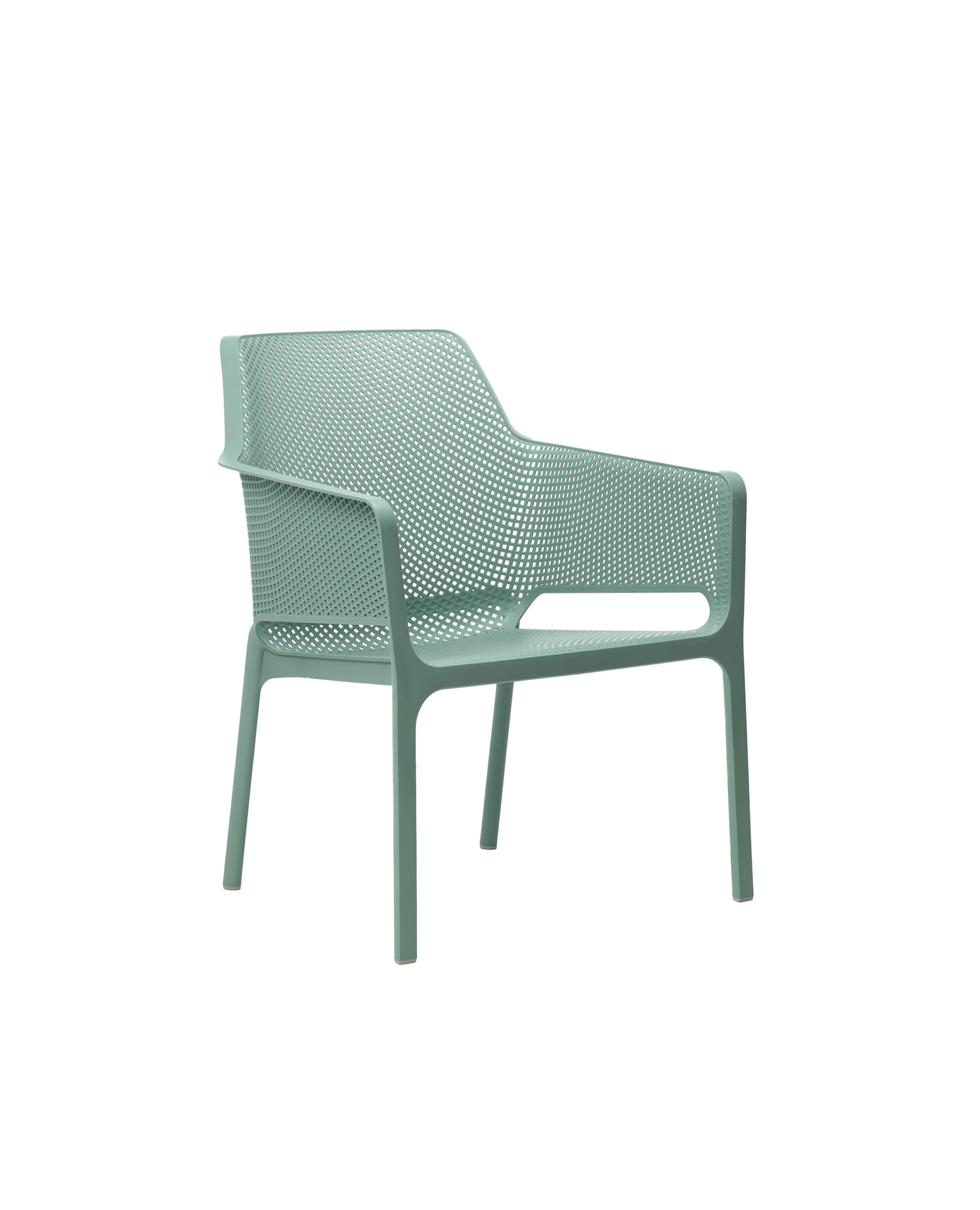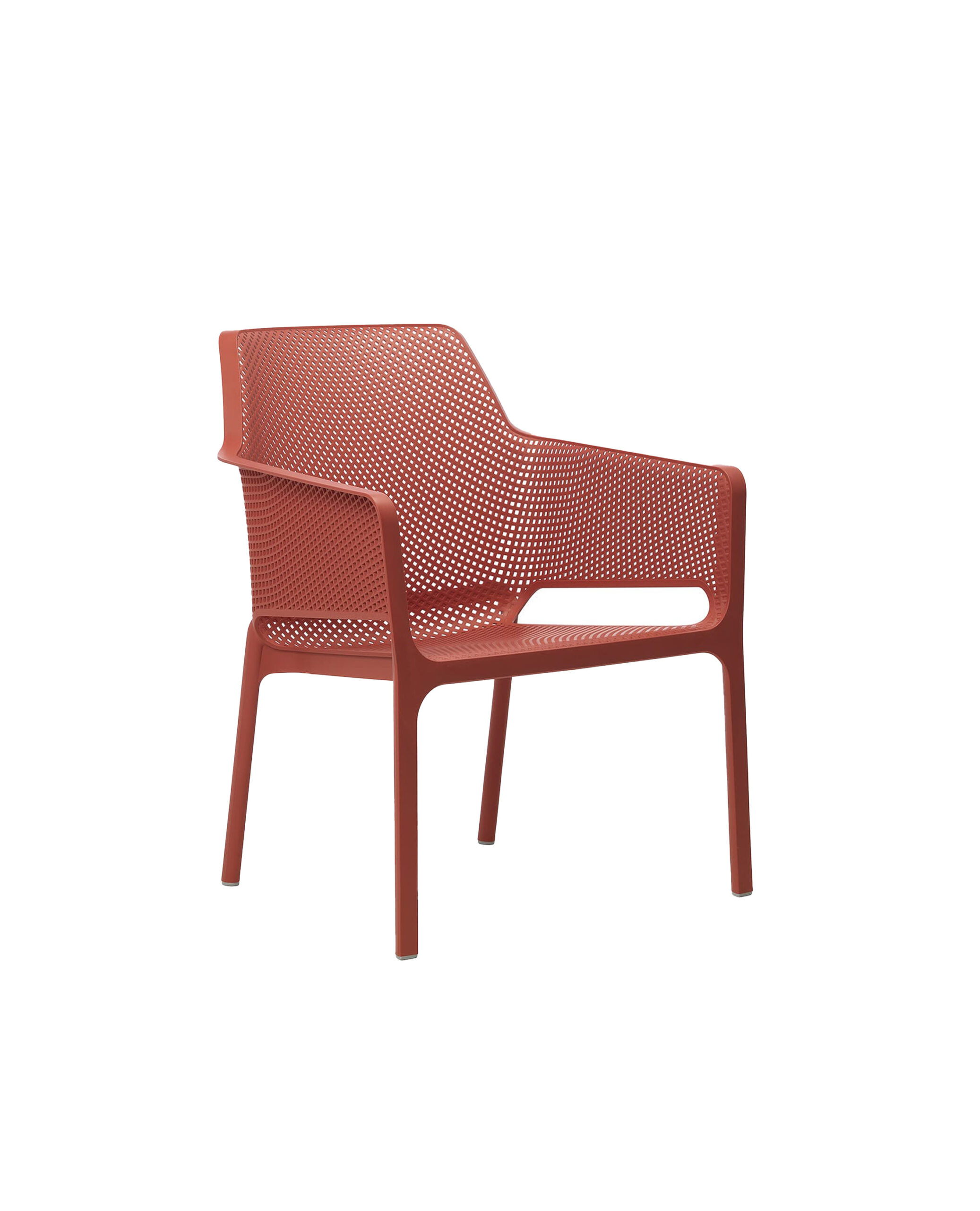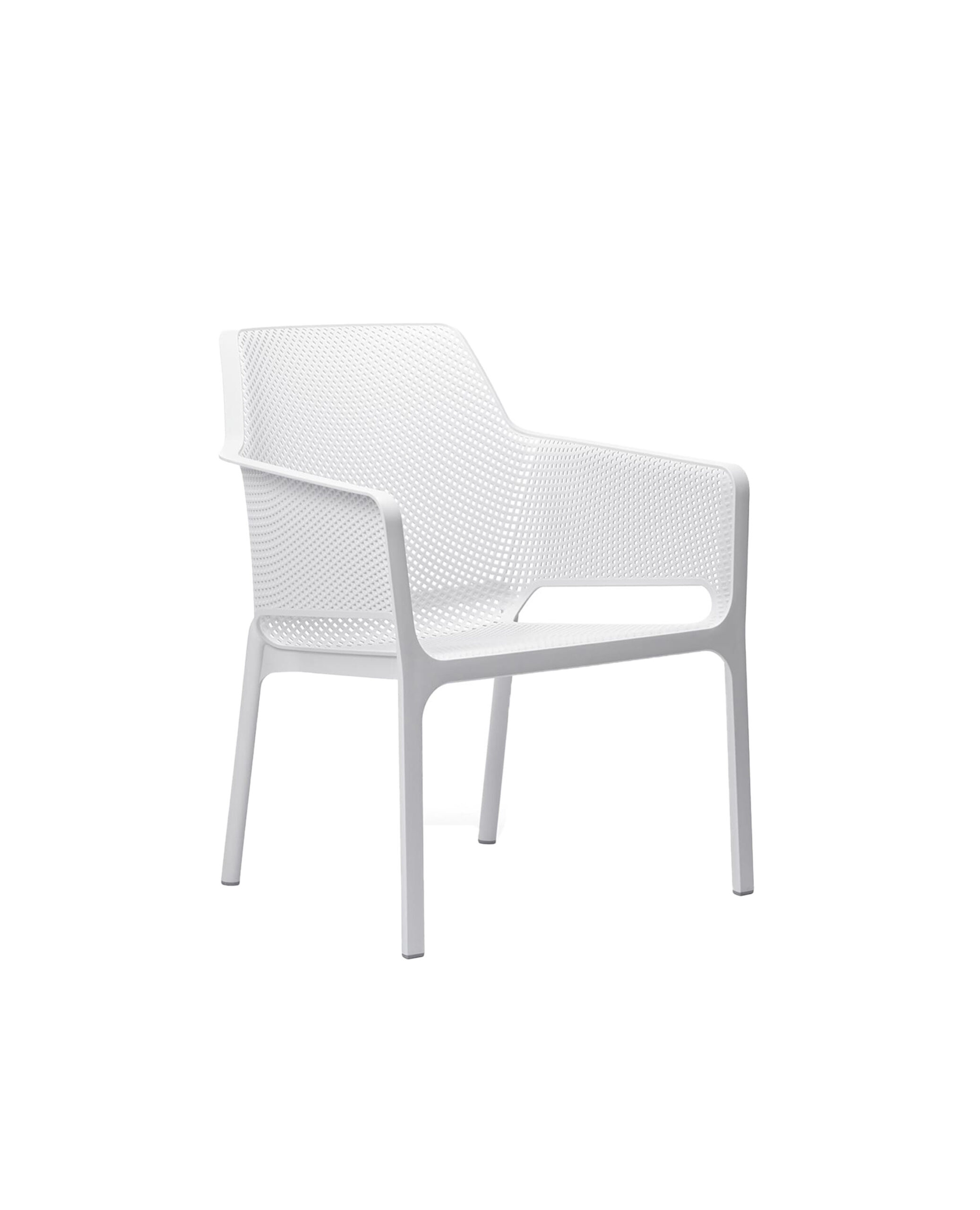 Sillón premiado en varias ocasiones de resina de fibra de vidrio acompañado de cojines de tejido propuestos en diferentes formas. Decorado con un motivo de agujeros cuadrados y rayados distribuidos en la superficie tridimensional de la silla, Net Relax es opaco y agradable al tacto.